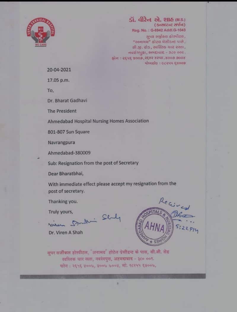 રાજ્યમાં (Gujarat) કોરોના મહામારીનો (corona pandemic) કહેર ચાલી રહ્યો છે. ત્યારે ખાનગી કોવિડ હોસ્પિટલોને (private Covid Hospital) રેમડેસિવીર ઇન્જેક્શનો (remdesivir Injection) અને ઓક્સિજન (oxygen) મળવામાં મુશ્કેલી પડી રહી છે. જેના કારણે અનેક દર્દીઓ તથા તેમના પરિવારને અનેક મુશ્કેલીઓનો સામનો કરવો પડી રહ્યો છે. આને કારણે હોમ આઈસોલેશનનાં દર્દીઓને પણ તકલીફ પડી રહી છે. ત્યાકે આ મુશ્કેલીઓ માટે સતત અવાજ ઉઠાવવા છતાં કોઈ નિરાકરણ ન આવતા અંતે અમદાવાદ મ્યુનિસિપલ કોર્પોરેશન દ્વારા હૉસ્પિટલ એન્ડ નર્સિંગ એસોસિએશન (આહના-AHNA)સેક્રેટરી પદેથી ડૉક્ટર વીરેન શાહે (Dr. Viren Shah) રાજીનામું આપી દીધું છે.